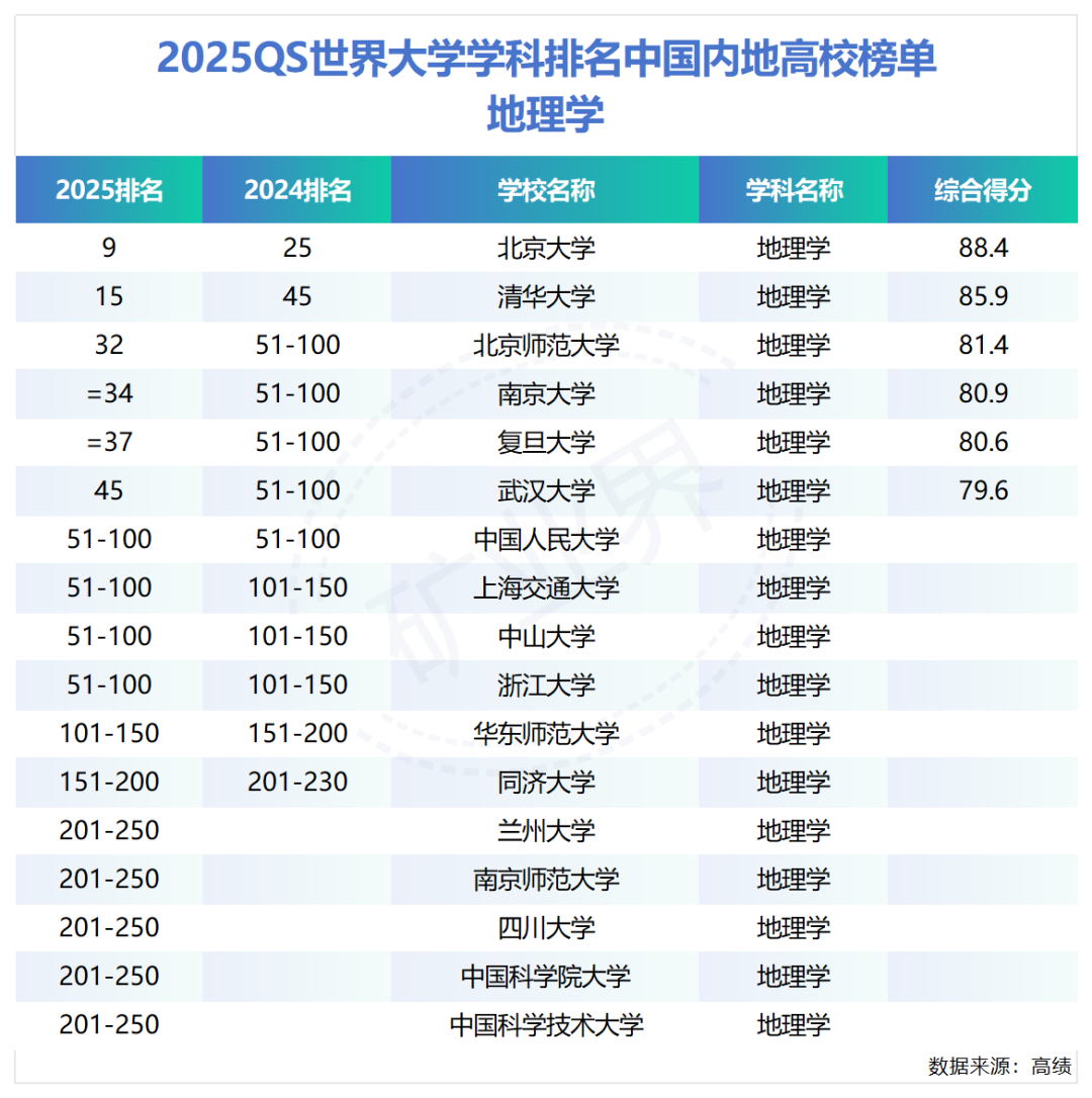 地理学学科榜单中共包含全球251所高校,17所中国大陆地区高校上榜。北京大学、清华大学、北京师范大学、南京大学、复旦大学、武汉大学等6所高校进入世界前50,排名分别为第9名、第15名、第32名、第34名、第37名和第45名,大多数较去年进步显著。其他进入世界前100名的高校还有中国人民大学、上海交通大学、中山大学和浙江大学。