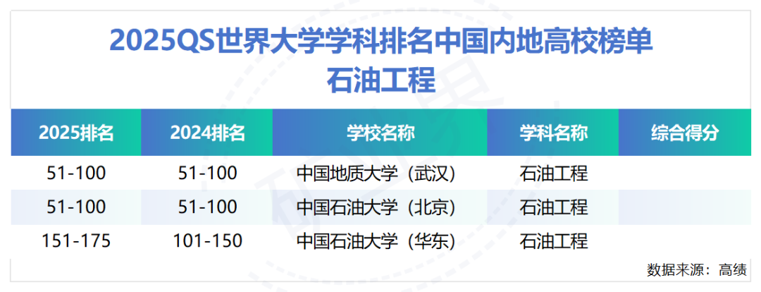 石油工程方面,全球共有176所高校参与排名,中国内地共有3所高校上榜,分别为中国地质大学(武汉)、中国石油大学(北京)和中国石油大学(华东),其中前两所高校进入了世界前100名。