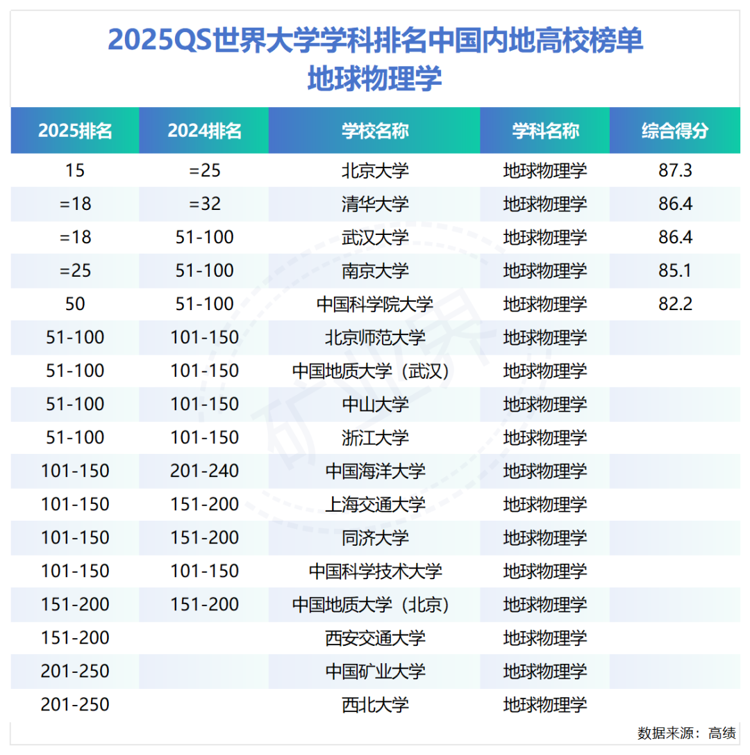 地球物理学排名共列入249所高校,其中有17所中国大陆高校上榜。北京大学、清华大学、武汉大学、南京大学和中国科学院大学等5所高校进入世界前50,北京师范大学、中国地质大学(武汉)、中山大学和浙江大学进入世界前100。