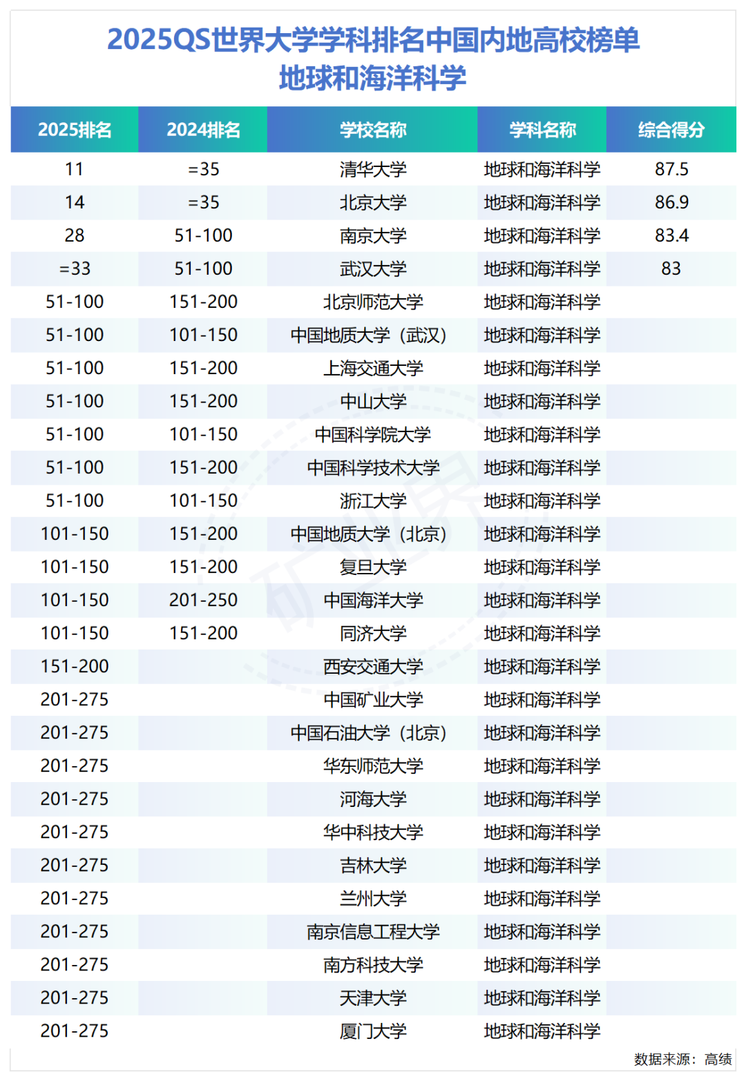 地球和海洋科学排名共包含230所高校,其中有27所中国大陆高校入围,其中清华大学、北京大学、南京大学和武汉大学等4所高校进入世界前50,北京师范大学、中国地质大学(武汉)、上海交通大学、中山大学、中国科学院大学、中国科学技术大学、浙江大学等高校进入世界前100。
