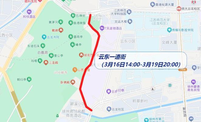 一、云东一道街(云龙山机动车出入口至泰山路):3月16日14:00至3月19日20:00除特种车辆外,禁止机动车辆停放、通行,上山车辆凭《通行证》通行。