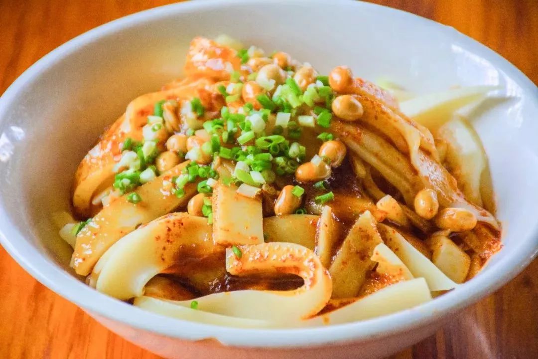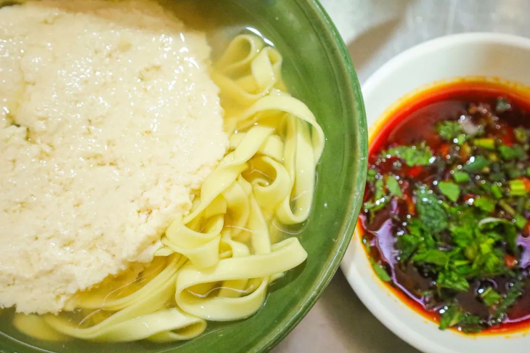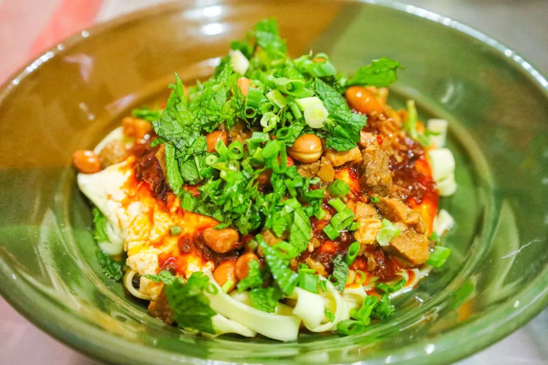 它采用优质豌豆为原料,经过水泡、细磨、滤渣、煮制和冷却之后,切为薄薄的长条状。口感细腻滑嫩、绵软不断。配上由花生、芝麻、中药材等佐料制作而成的油辣椒,麻辣开胃,爽口解腻。
