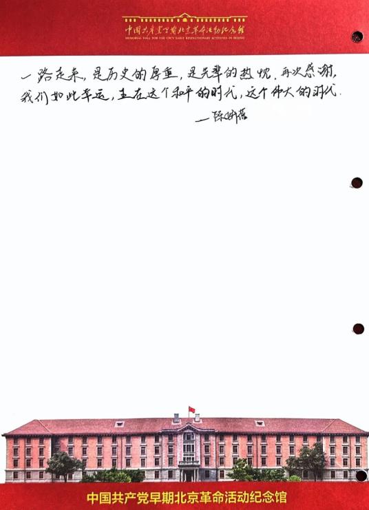 自2021年6月29日中国共产党早期北京革命活动纪念馆向公众开放以来,前来参观学习的团体和个人络绎不绝。大家认真观看了“光辉伟业 红色序章——北大红楼与中国共产党早期北京革命活动主题展”,追寻红色起点,汲取前行力量。在北大红楼一层的59号展厅内,设有一本特别的“留言簿”,这里已成为众多观众抒发内心感慨的温馨角落。不少参观者在饱览展览内容后,纷纷在“留言簿”上写下自己的心得体会和深刻感悟。这些文字不仅记录了他们对革命先辈的敬仰之情,更表达了对未来奋斗的坚定信念。让我们一同翻开这本“留言簿”,感受那份穿越时空、历久弥新的红色精神。