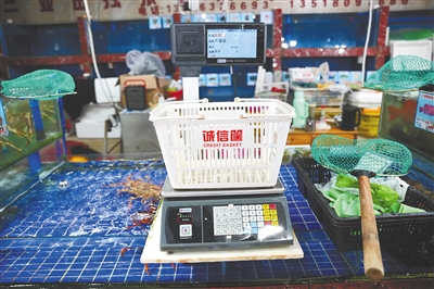 这是该市场海鲜称重筐的重量。放眼望去,市场内300余个海鲜摊位,每一个海鲜摊主称重时,都会用同样的筐,五面镂空,筐身上写着“诚信筐”3个字。捞起海鲜时,镂空能让多余的水分迅速滤出,避免了重量虚增问题。