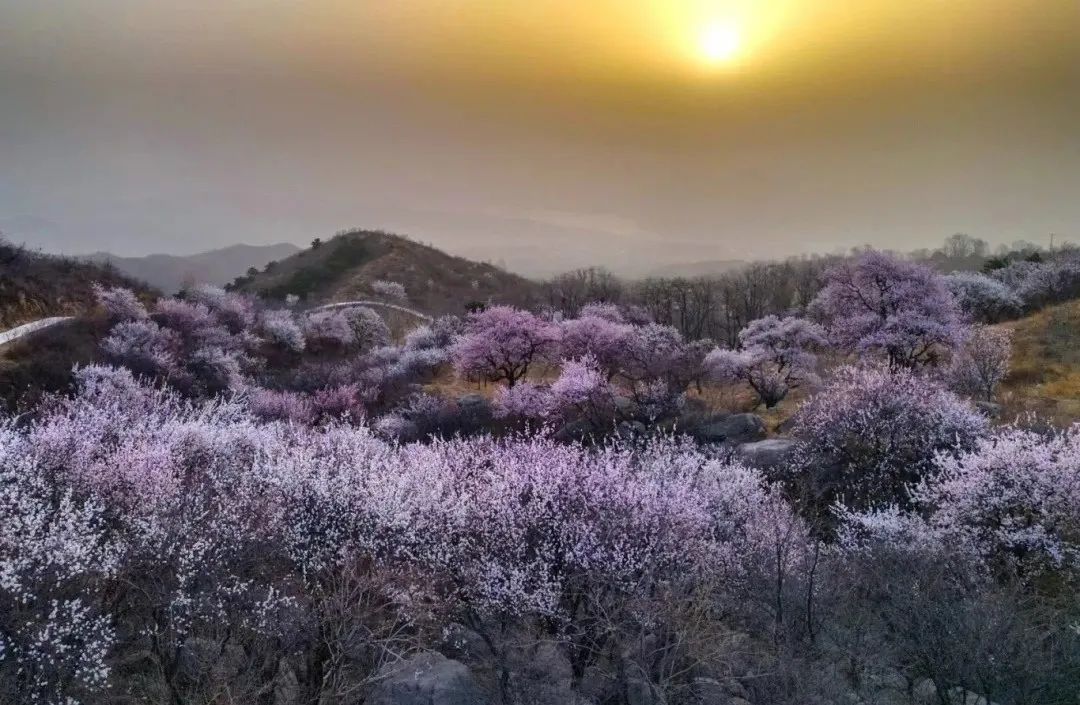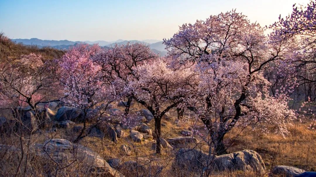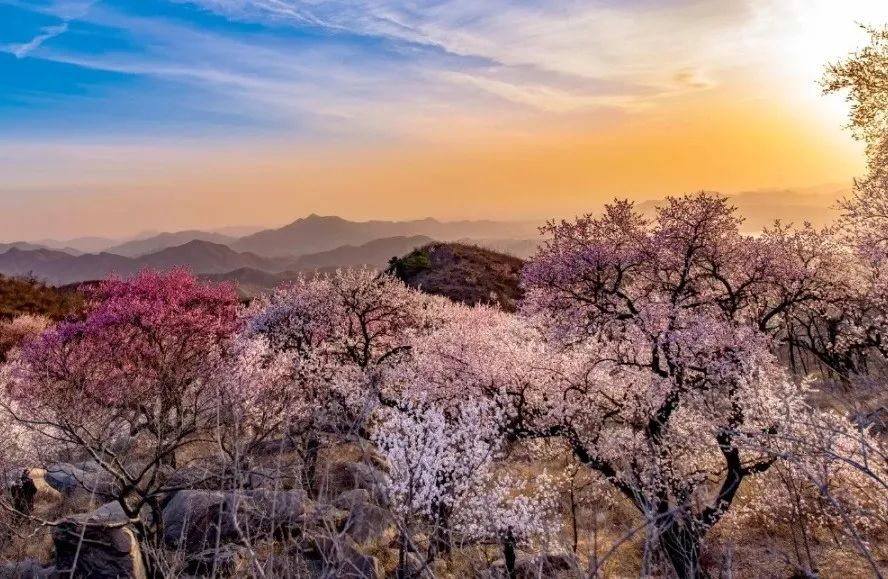一瞬间,漫山遍野被染成了烂漫的粉白