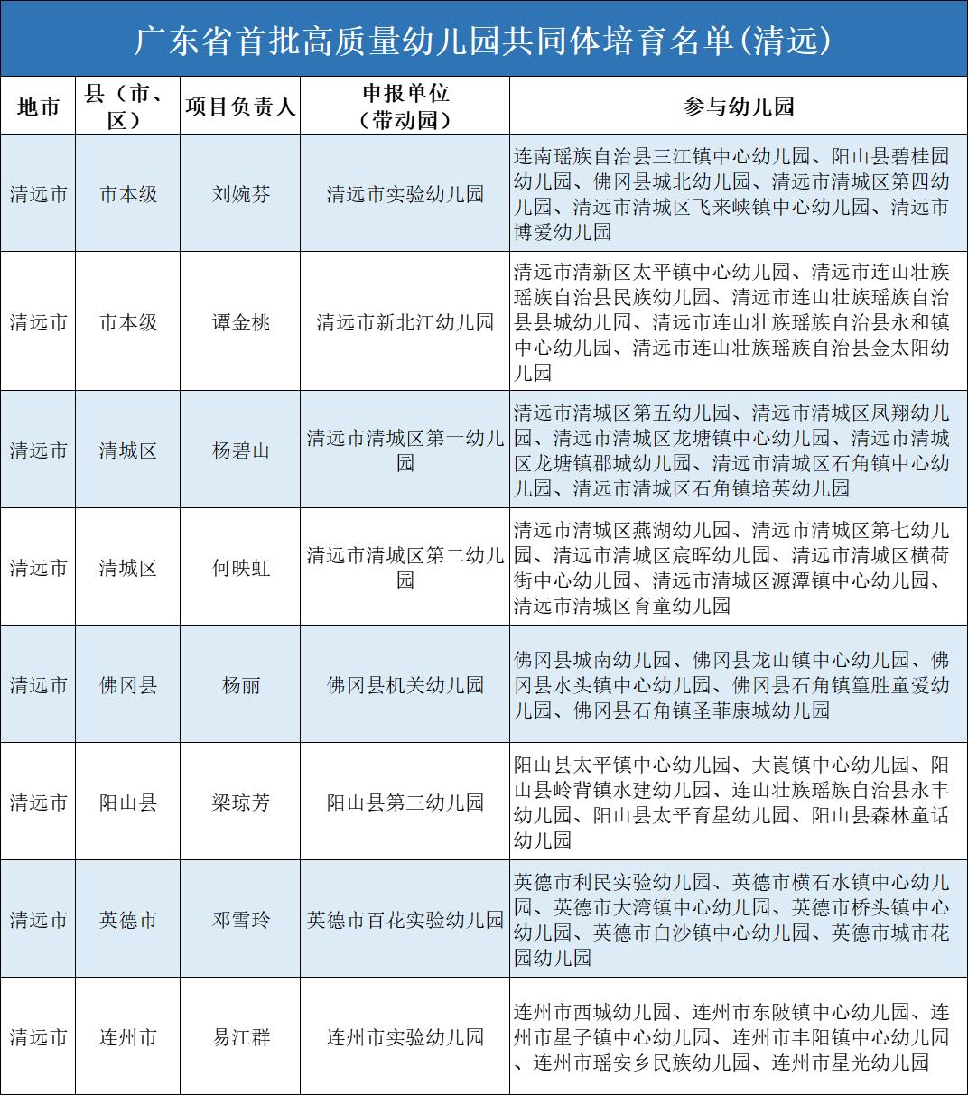 近日,广东省教育厅印发《关于公布首批高质量幼儿园共同体培育名单和做好建设管理工作的通知》(下称“通知”),公布首批高质量幼儿园共同体培育对象名单,并就资金使用和建设管理提出要求。经幼儿园自评、共同体组建、县级初审、地市审核推荐、省级复核等程序,确定首批182个高质量幼儿园共同体培育对象,覆盖21个地市,共1453所幼儿园,其中清远市将培育8个高质量幼儿园共同体,有46所幼儿园入选。
