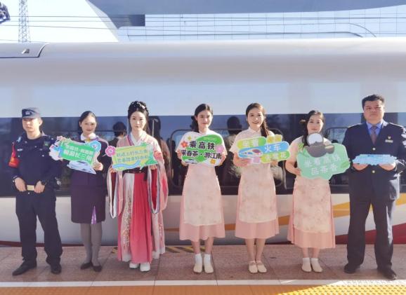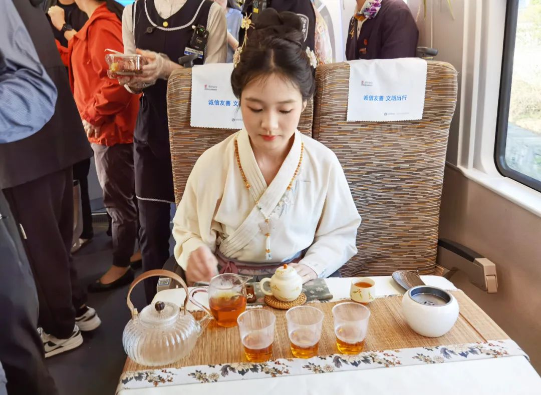 一盏安吉白茶,韵染春日雅意。当日16时许,G3244次列车从安吉站驶出,茶文化车厢绿意盎然,南宋点茶、国风舞蹈一一上演,在茶香氤氲中开启美好旅途。