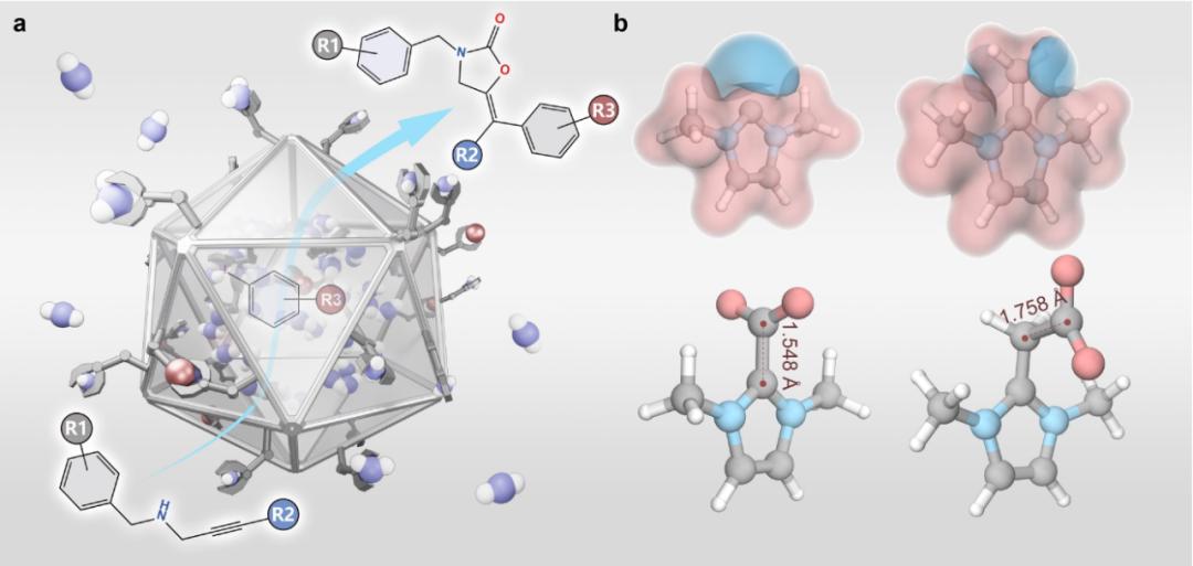 本研究通过综合运用多种光谱技术并结合密度泛函理论计算,阐明了无机-有机双位点协同催化机制。该机制不仅实现了C=O、C≡C和C-I键的协同活化,同时完成了CO2的捕获与活化,并将其转化为NHO-CO2加合物及分子内环化中间体。研究结果展示了耦合无机单原子和功能有机位点进行多组分催化反应的巨大潜力。