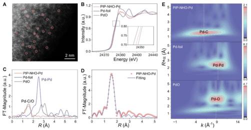图2总结了PIP-NHO-Pd的原子结构分析。通过球差-高角环形暗场像-扫描透射电子显微镜(AC-HAADF-STEM)、X射线吸收近边结构(XANES)、扩展X射线吸收精细结构(EXAFS)、EXAFS的傅里叶变换(FT-EXAFS)等表征,结果表明PIP-NHO-Pd中的金属Pd是以单位点的形态存在。
