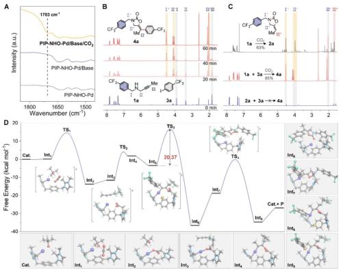 图4总结了NHO辅助的CO2催化转化机理。PIP-NHO-Pd、PIP-NHO-Pd/NaOtBu和PIP-NHO-Pd/NaOtBu/CO2的FI-IR,1H NMR跟踪监测PIP-NHO-Pd催化的4C-TCRs进程,DFT计算显示PIP-NHO-Pd/NaOtBu催化1a、3a和CO2的4C-TCRs的反应势能面,显示了中间体和过渡态的构型以及决速步骤的势垒。