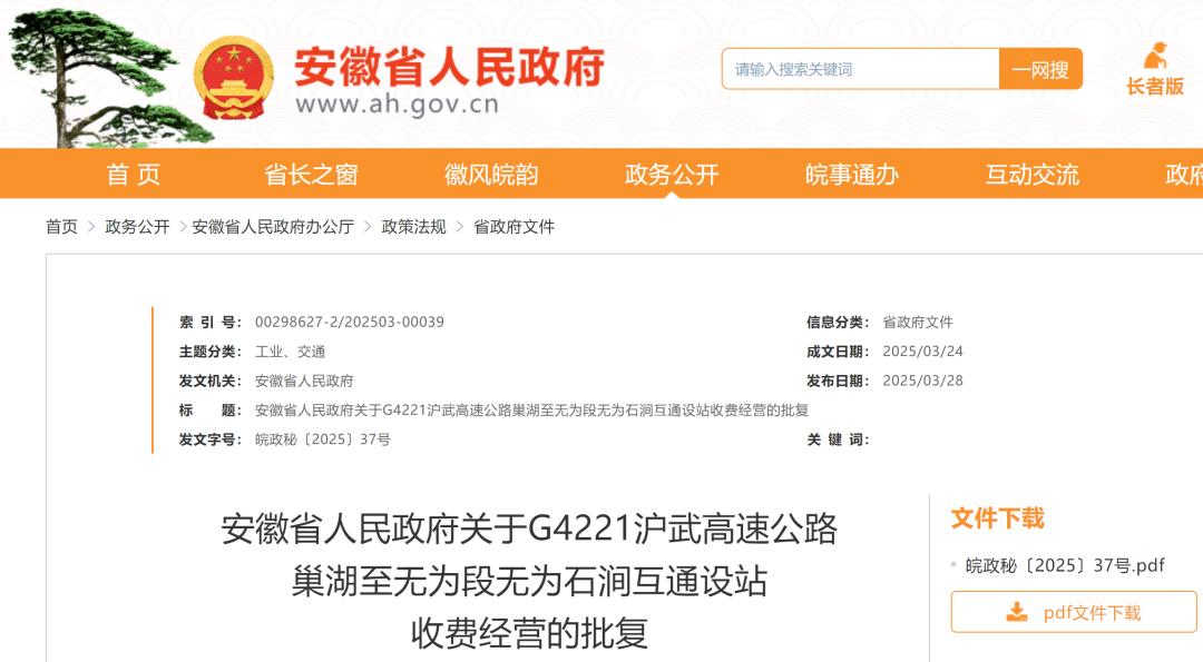 《关于G4221沪武高速公路无为石涧互通设站收费的请示》(皖交路〔2025〕50号)悉。经研究,现批复如下: