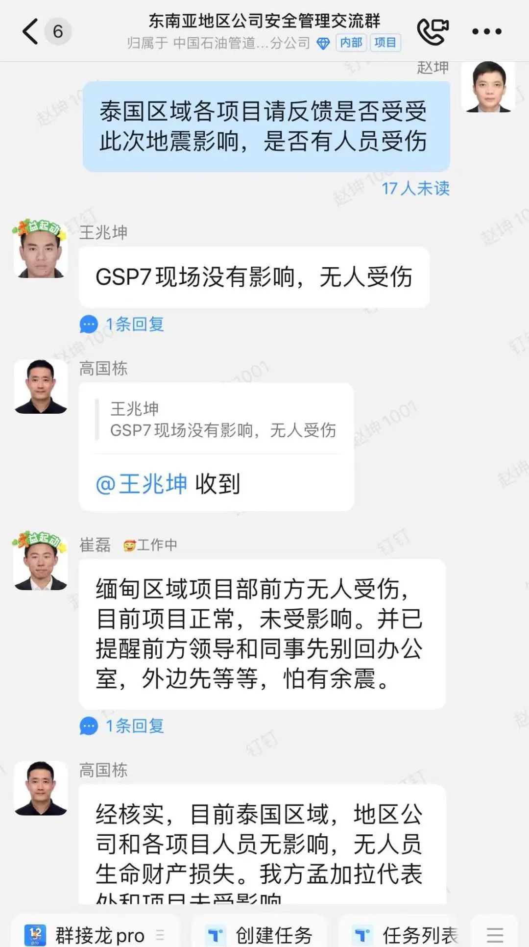 东南亚地区公司缅甸区域项目分布在仰光省和马圭省,距离震中有一定距离。管道局缅甸仰光代表处及项目距离震中较远,震感强烈但破坏性不大。目前,人员均已确认安全,处于各自岗位。所属迪落瓦罐区运行维护项目,当林炼厂罐改造和管道项目工作一切正常,员工情绪稳定。下一步,各项目部将加强联络,及时沟通,确保人员安全,有序推进项目。