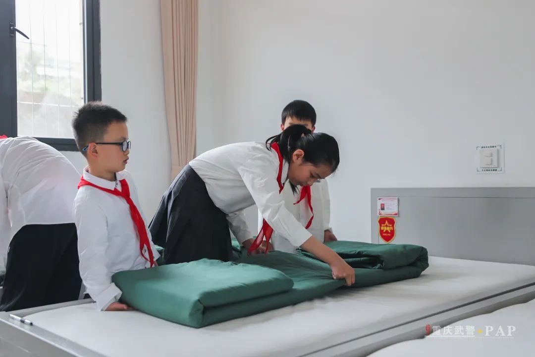 在班宿舍,规范的内务设置让同学们惊叹不已。豆腐块般的被子、整齐排列的物品,彰显着军人严谨的生活作风。官兵现场演示了叠被子的技巧,而后同学们在官兵的带领下纷纷上手体验。