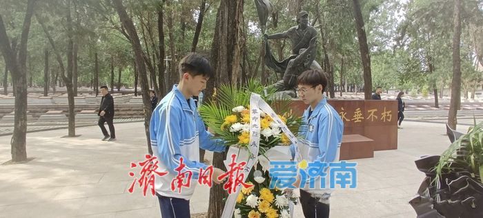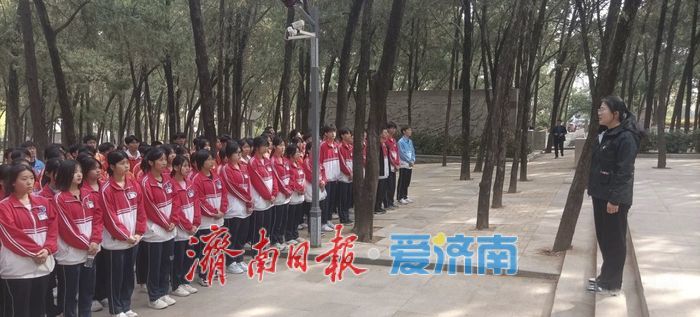 上午9时,祭扫活动在庄严肃穆的氛围中开始。学生们整齐列队,肃立于历城革命烈士陵园“前仆后继”主题雕塑前。全体人员高唱国歌,并向革命烈士默哀致敬,随后学生代表向革命烈士敬献花篮、整理挽联,挽联随风飘动,寄托着师生们对先烈的无限哀思与崇高敬意。