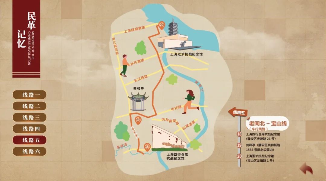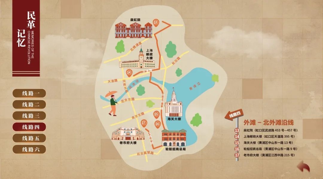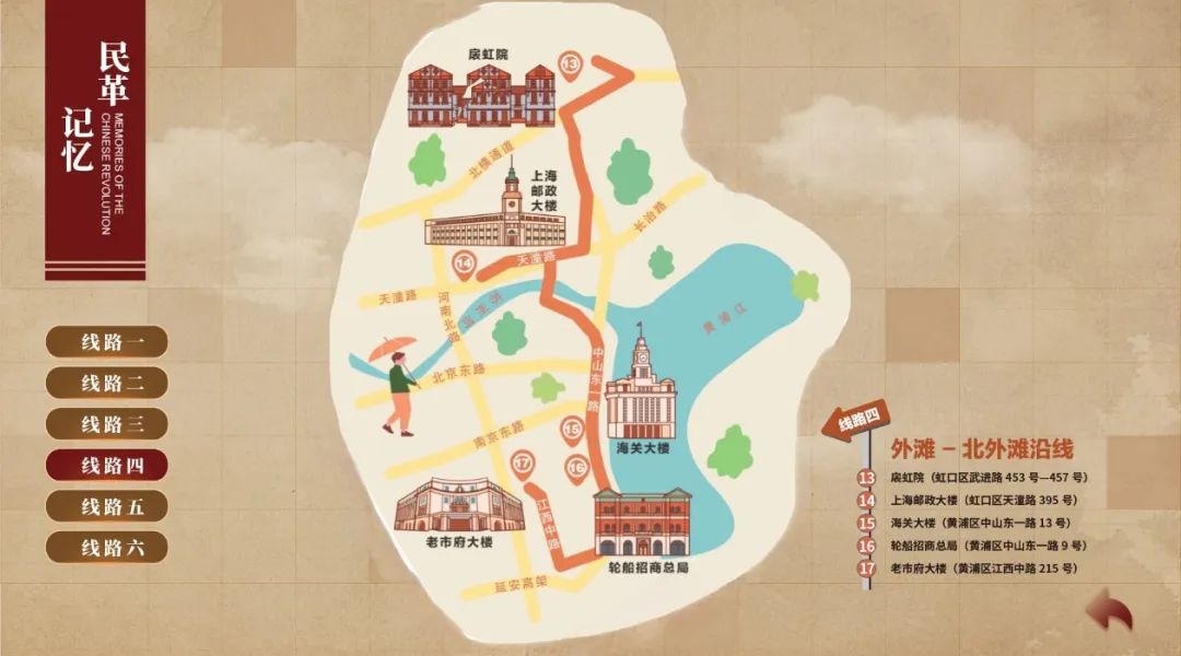 这些City Walk路线,是根据《岁月留影》一书中的老建筑所在位置同步设计制作的。行走路线以“点”“线”“面”结合的方式精心设计,包括思南路风貌区、衡复风貌区、愚园路沿线、外滩沿线、新静安宝山沿线和金山沿线,覆盖黄浦、静安、徐汇、虹口、长宁、宝山、金山等7个区,涉及上海孙中山故居纪念馆等23个打卡点。