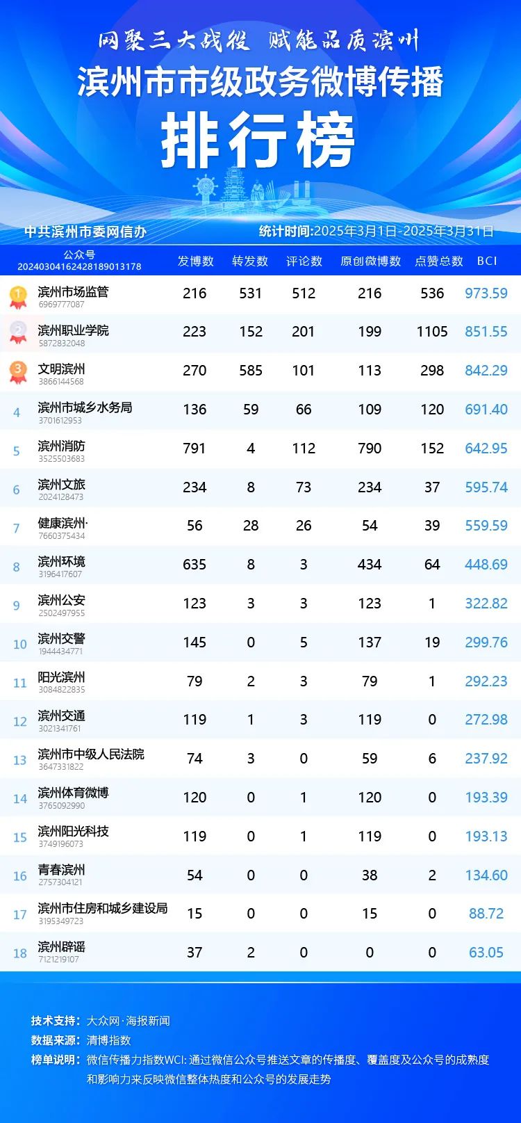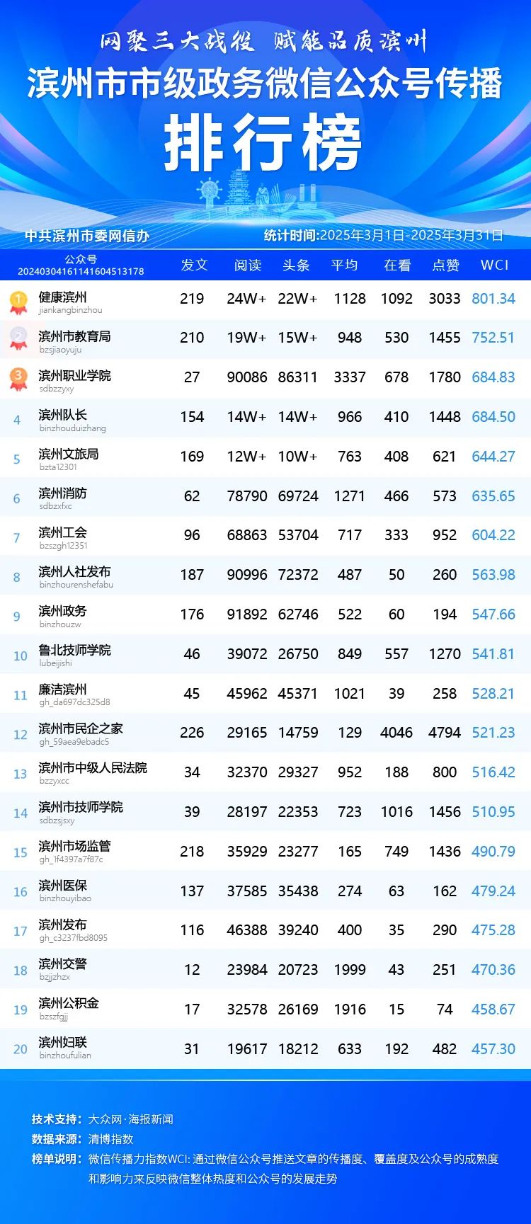 原标题:《2025年3月滨州市市级政务新媒体传播影响力排行榜》