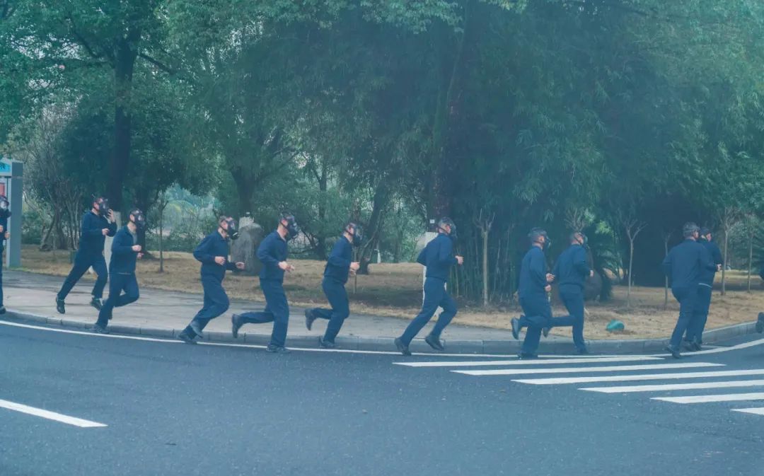 官兵们正戴着防毒面具