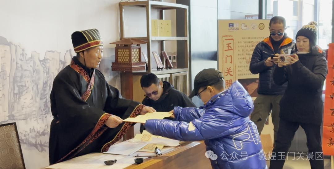 文牒通关趣味浓。游客们手持特制的通关文牒,仿佛化身为古代的商旅或使者,穿梭于各个景点之间。景区还专门设置了集章打卡点,提供特色纪念章。一枚枚精美的印章图案,融合了玉门关的关城风貌、诗词人物等元素,让游客爱不释手。“集章打卡既有趣,又能留下旅行的美好回忆,这些印章太有纪念意义了。”