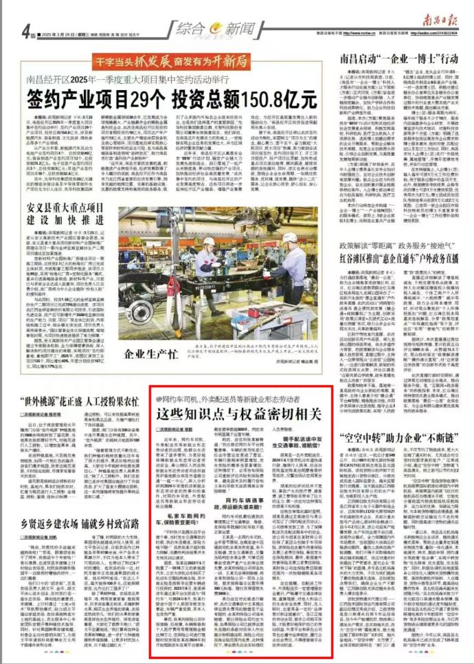3月26日,《南昌日报》报道青山湖区法院维护新就业形态劳动者合法权益工作,刊登《@网约车司机、外卖配送员等新就业形态劳动者,这些知识点与权益密切相关》一文,通过"以案释法+风险预警"的方式,为穿梭于城市街巷的劳动者亮起权益保障的"信号灯"。
