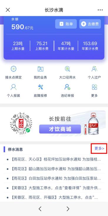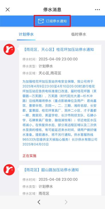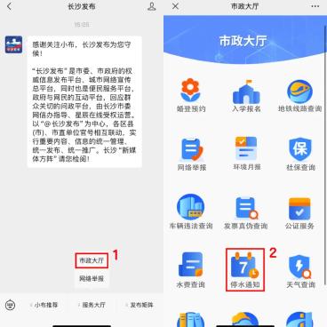 关注微信公众号“长沙发布”,点击菜单栏“服务大厅—市政大厅”。进入“市政大厅”页面后点击下方“停水通知”按钮,即可查看最新停复水消息。