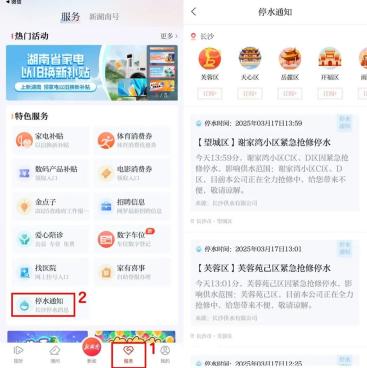 下载“新湖南”APP,点击首页下方“服务”按钮,再点击“停水通知”,即可查看最新停复水消息。