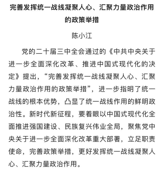 原标题:《陈小江:完善发挥统一战线凝聚人心、汇聚力量政治作用的政策举措》