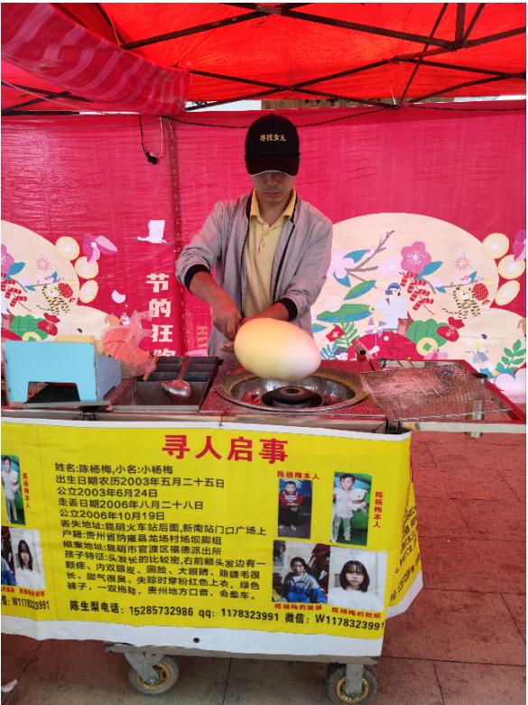 ▲陈生梨在寻找女儿的路上卖棉花糖