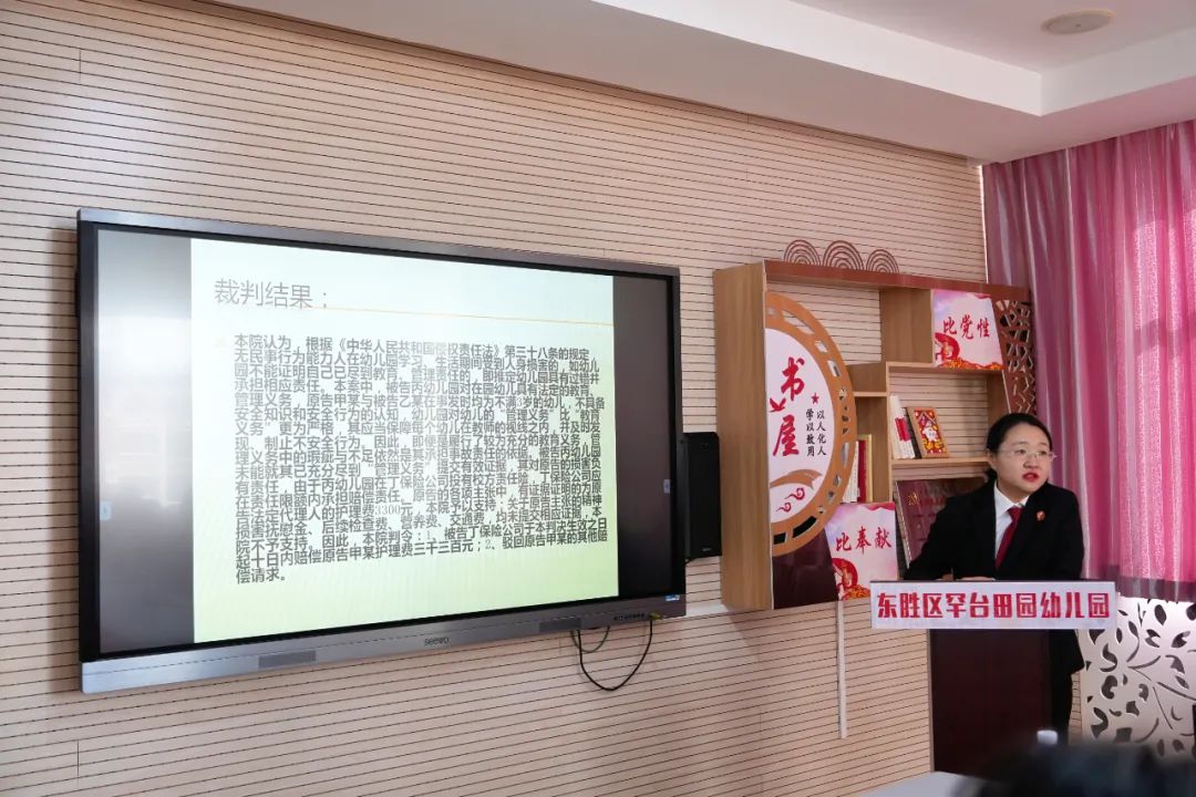 普法讲座上,张波法官向幼师们从涉及幼儿园的侵权责任纠纷案例、最高检发布的涉及未成年人性侵的《1号检察建议》、涉及未成年人的交通安全案例等方面进行普法解读;并结合个人审判经验,就校园安全、电信诈骗、禁毒安全知识等方面向老师们进行宣讲。张波法官通过案例讲解、观看视频、互动问答等生动的普法形式,协助幼儿园开展法治宣传教育,为构建平安校园提供法律保障。