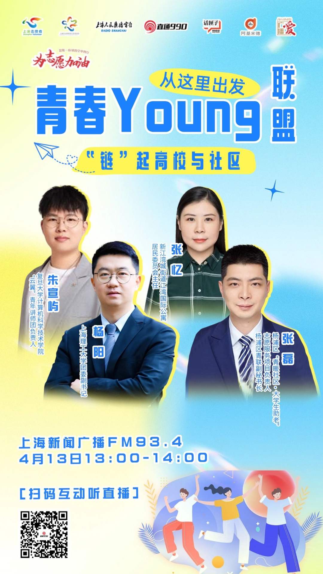 主持人一野对话杨浦区“青暖社区•大学生助老”志愿服务项目负责人、杨浦区青联副秘书长张磊、上海理工大学团委副书记杨阳新、江湾城街道江湾国际公寓居民委员会主任 张忆、复旦大学计算机科学技术学院“云翼”青年讲师团负责人朱宣屿。