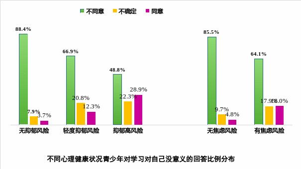 有留守经历、缺乏父母关怀及亲子沟通、师生关系疏远、同学关系不佳的青少年有更高的抑郁、焦虑风险;心理健康状况好的学生在学习上更努力、有更强的内部学习动机;而心理健康风险较高的学生有更高比例不想上学,学业韧性更差,学习效能感更弱。