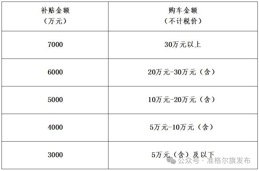4月1日—5月31日期间,在我旗的新车销售企业购买全新7座(含)以下的非营运乘用车(不含各类货车、专项作业车、三轮车、摩托车等),开具我旗机动车销售统一发票,并于6月30日前在我旗落户的个人消费者,按照不计税价车价30万元以上的发放补贴7000元;20万元—30万元(含)的发放补贴6000元;10万元—20万元(含)的发放补贴5000元;5万元—10万元(含)的发放补贴4000元;5万元(含)以下的发放补贴3000元。