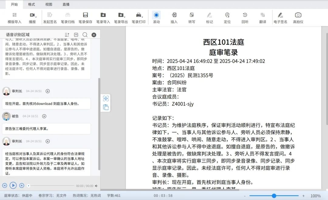 本次智慧法庭新升级智能语音识别系统,可实时将庭审语音转化为文字,支持多方言、多角色语音区分,自动生成结构化庭审笔录,准确率高达95%以上。语音文字识别转换与庭审笔录分区显示,采用“左看右写”方式,书记员仅需校对修正,工作量降低50%。关键词自动标记、法律术语精准识别,帮助法官快速回溯争议焦点,提升合议效率。可提前添加案件中涉及的姓名、地点等热词,实现笔录自动校对。语音与文字双备份,确保庭审记录完整可查,为后续裁判提供可靠依据。