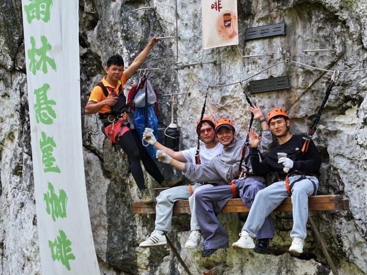在勐远仙境悬崖咖啡项目起点,来自四川成都的秦先生正在穿戴安全装备。随后,他将在教练保护下,沿着近乎垂直的岩壁攀爬几十米,再紧贴崖壁穿过独木板和钢丝绳索,最终在距地面约100米的悬崖木板上,品尝一杯现磨手冲的云南小粒咖啡。