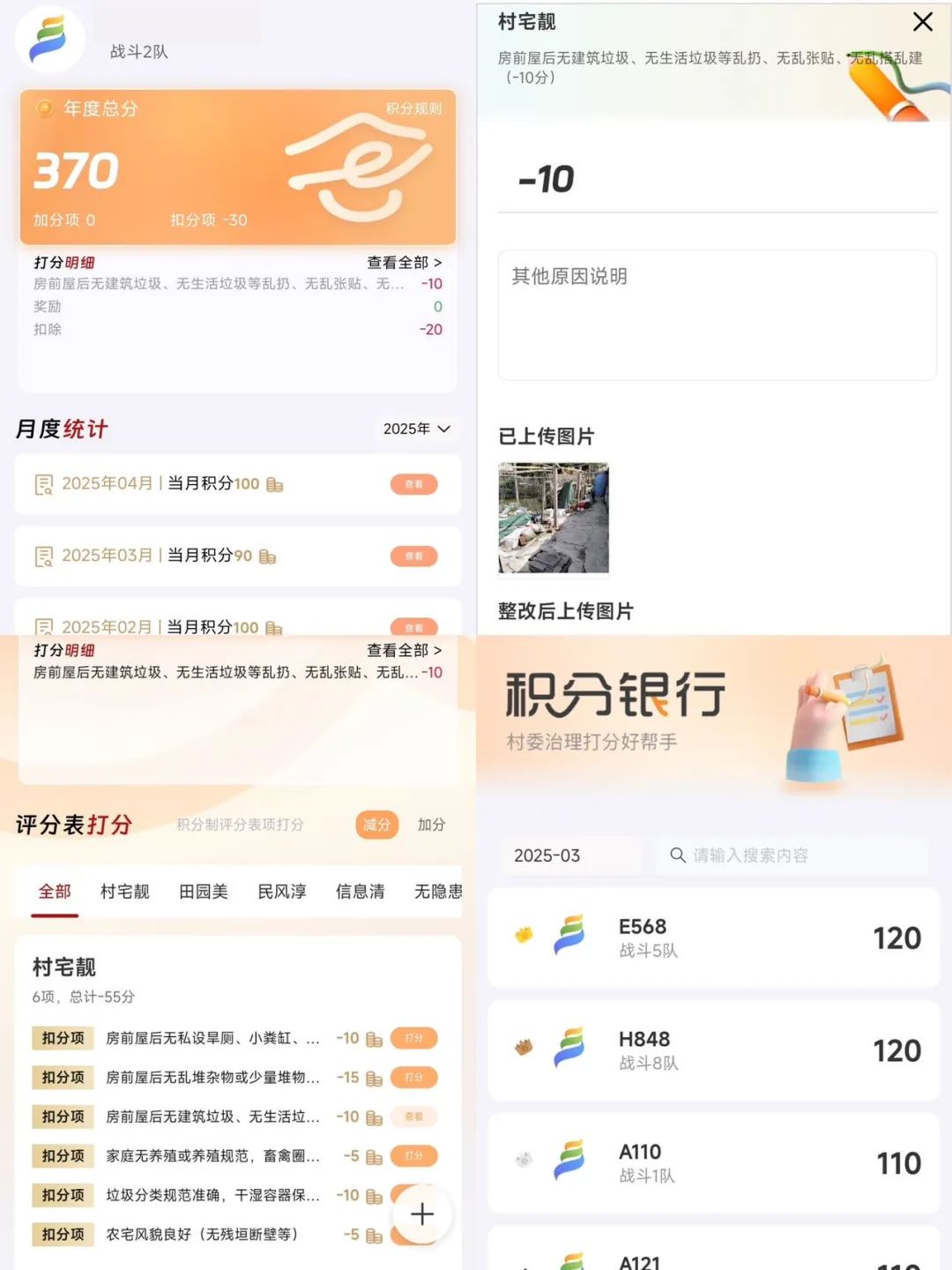 据介绍,赵厅村的人居环境积分检查涵盖农宅环境、田园环境、文明新风、租赁管理、平安建设、负面清单等6大项18小项及特色积分项。作为工业区首批试点数字化积分管理的乡村,赵厅村已经通过小程序实现“一户一账”全流程电子化。村民登录后可以实时查看年度总积分、月度得分及扣分照片,还能获取整改建议。