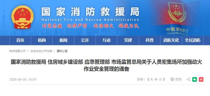 为深刻汲取人员密集场所违规动火作业引发的群死群伤火灾事故教训,坚决防范遏制重特大生产安全事故,根据《中华人民共和国安全生产法》《中华人民共和国消防法》《中华人民共和国建筑法》《建筑防火通用规范》(GB 55037-2022)等法律法规、技术标准规定,经商教育部、工业和信息化部、民政部、交通运输部、商务部、文化和旅游部、国家卫生健康委、体育总局、国家宗教局、国家铁路局、中国民航局、国家文物局同意,现就人员密集场所加强动火作业安全管理有关事宜通告如下: