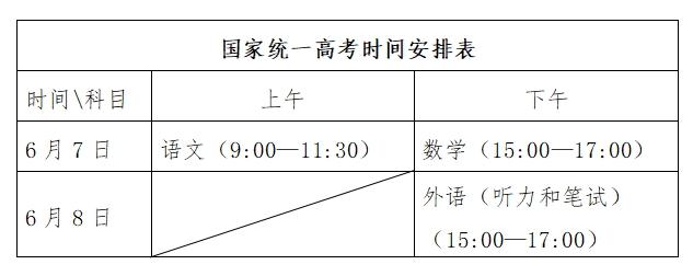 (一)国家统一高考。国家统一高考科目使用全国统一命题试卷,考试时间安排在6月7日全天和6月8日下午,其中语文考试时间为150分钟,数学考试、外语(听力和笔试)考试时间为120分钟。外语听力测试安排在外语笔试考试开始前进行。