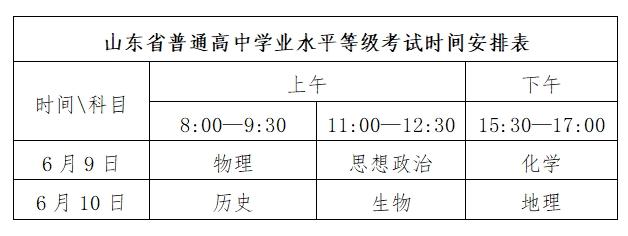 (二)普通高中学业水平等级考试。普通高中学业水平等级考试由山东省自主命题,考生从思想政治、历史、地理、物理、化学、生物等6个科目中选报3科参加考试。考试时间安排在6月9日—10日,每科考试时间为90分钟。