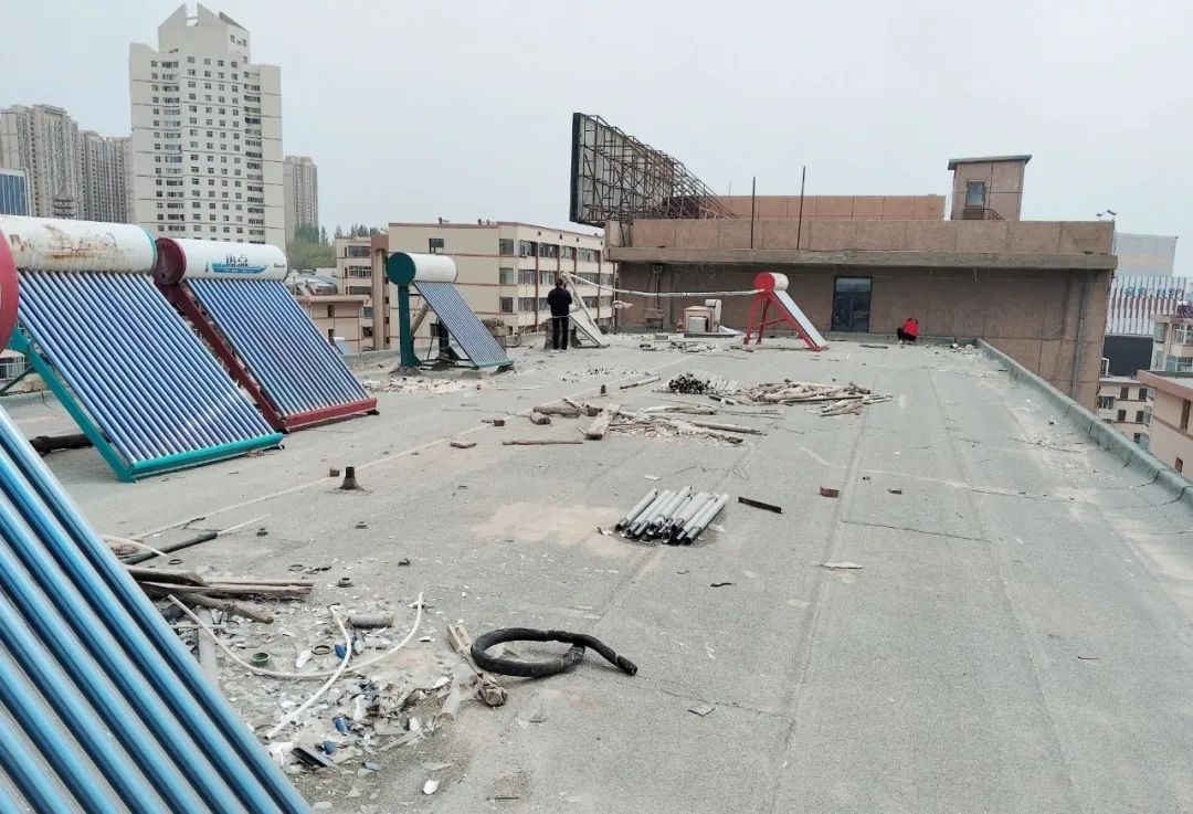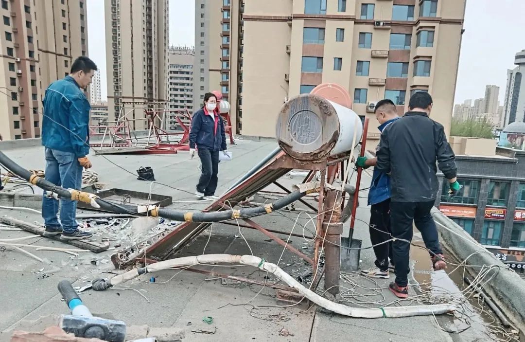 近期,受天气变化影响,大风、沙尘天气频发,居民小区楼顶的废弃太阳能热水器成为一大安全隐患。人民路街道中心街社区对欣荣小区开展废旧太阳能拆除工作,得到了居民们的支持和认可。