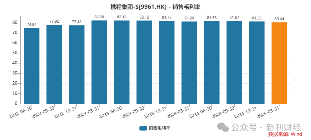 盈利能力层面,携程集团延续其高毛利的商业本质。根据Wind数据,2025年第一季度公司毛利率为80.44%,虽较2024年末的81.25%略有回落,但近两年持续稳定在80%以上水平,展现出其旅游服务生态的盈利能力。