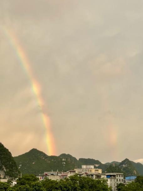 去年暑假,我参加了学院“山海同心,诗以传教”暑期支教队,赴广西天等开展诗教实践。某个傍晚,山雨初歇,我与孩子们一起读诗。不知是谁轻声喊了一句:“老师,快看双彩虹!”窗外,两道彩虹并肩悬在山谷间。我震颤。孩子们却笑语盈盈,说双彩虹在这里并不罕见,这是群山特有的馈赠,很开心能跟我分享这一“特产”。