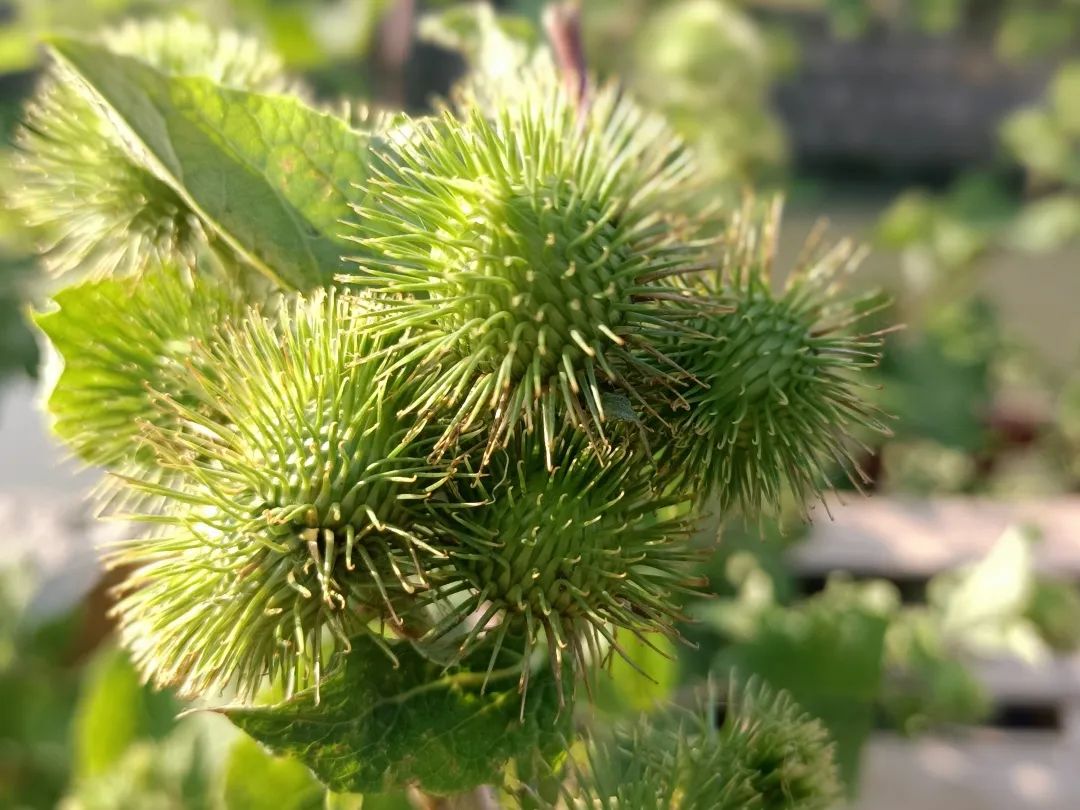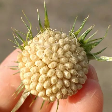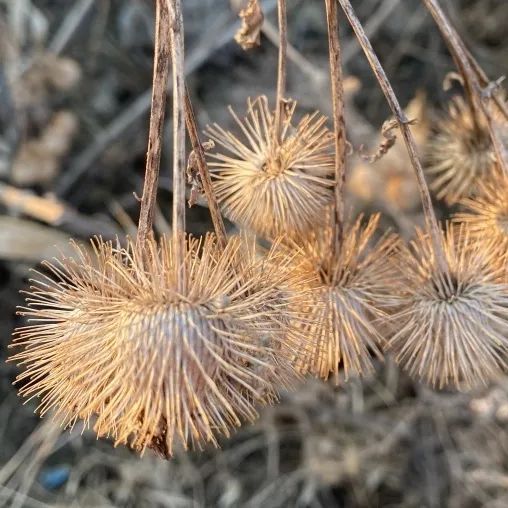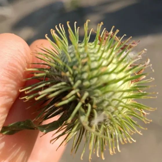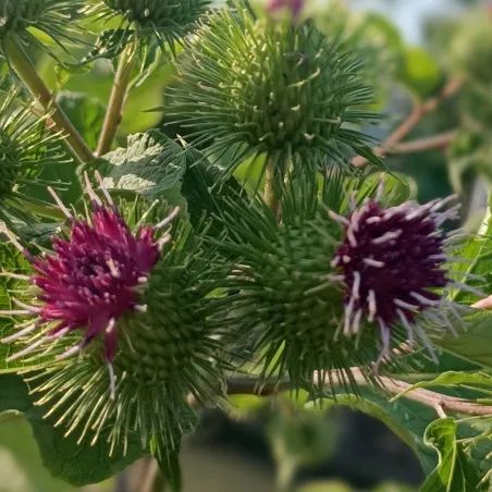 花序由管状花构成。牛蒡的小花颜色为紫红色,外部顶端呈钩状。