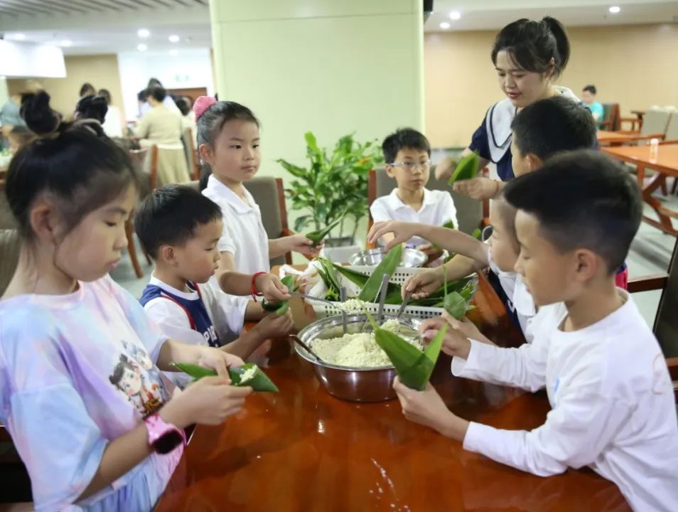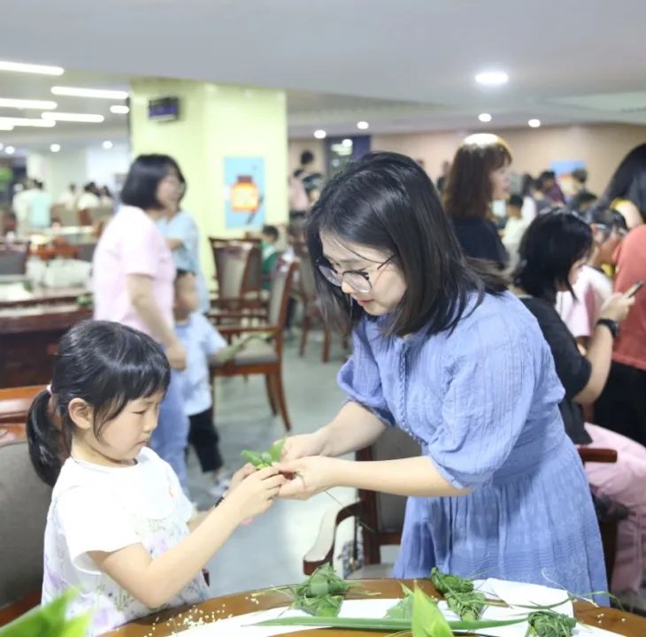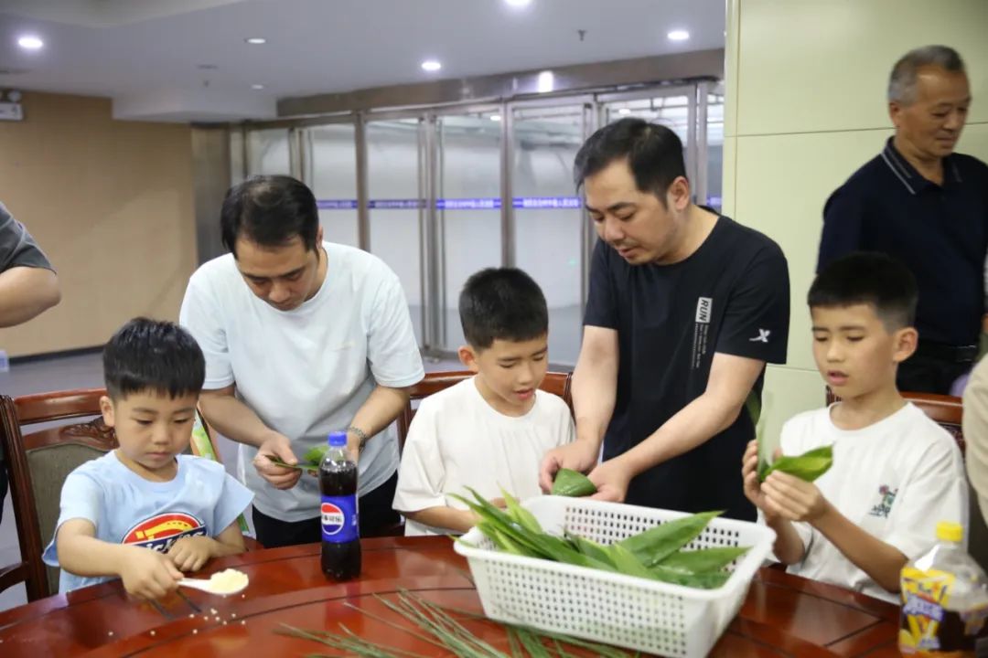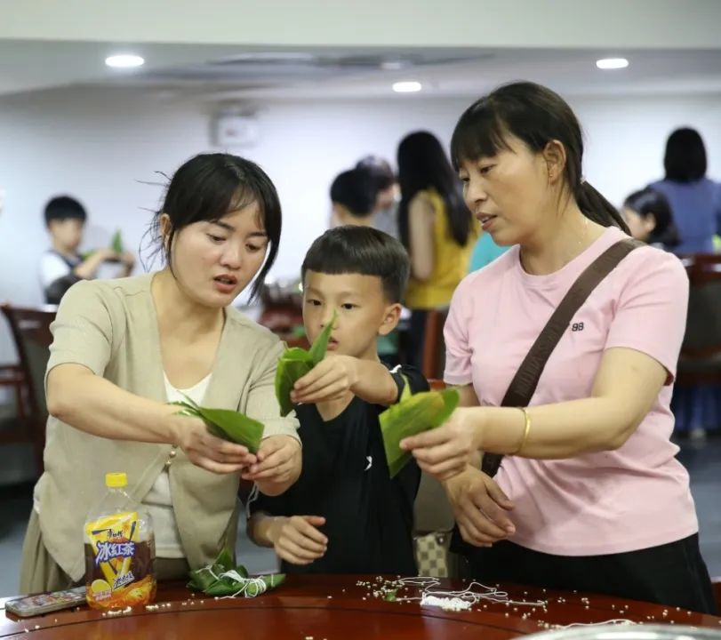 参加活动的亲子家庭兴高采烈地来到职工食堂,令人期待的“传承文化 品味亲情”包粽子环节开始了,浸泡好的糯米、新鲜的粽叶、棉绳等材料逐一摆开,亲子家庭摩拳擦掌、各显身手。家长们耐心示范卷粽叶、填糯米、扎粽绳的技巧,孩子们学得有模有样。“这哪里是粽子,是包谷粑粑吧!”“捆紧了不散就行了”……,活动中的小插曲惹得现场笑声阵阵。一双双小手与大手默契配合,对传统文化魅力的感受、端午习俗的理解及亲子之间的感情,全都包裹进形状各异的粽子里。