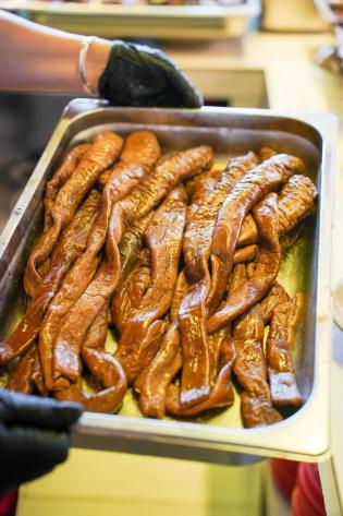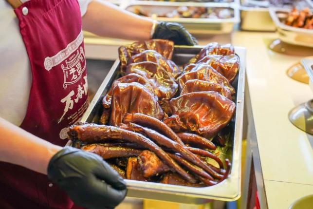 老鼎万春卤菜的卤品主打肥肠、排骨等荤食,素菜也应有尽有,用不花哨的手法做出做地道的风味,还有特色卤水火锅,全家共享,老少皆宜。