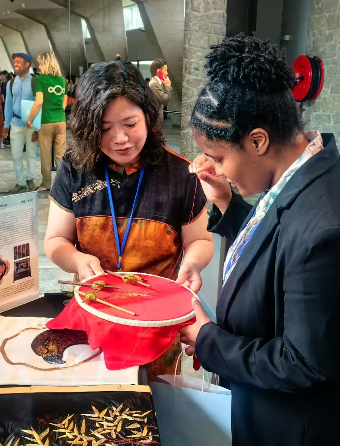 活动现场精心设置“乐享美食”“名茶品鉴”“非遗互动”“VR体验”四个区域。“风雅宋韵”主题宴以仿南宋官窑青瓷餐具盛装东坡肉、蟹酿橙等宋代经典菜式,营造简素清雅的美学氛围;孔府家宴展示“孔府六艺冷拼牡丹花”食雕技艺,生动诠释儒家“礼食合一”的哲学内核;禅茶一味,千年传统——径山茶宴携宋韵点茶演绎东方美学,融汇古今之雅;“十二道点茶仪轨”、潮州工夫茶让嘉宾领略中国茶艺的精妙之处;潮绣传承人运用“垫高绣”技法,现场创作牡丹纹样;糖画艺人手持铜勺,“挥糖成画”,十二生肖造型在糖浆凝固前灵动成型,趣味十足,让在场嘉宾近距离触摸到中国传统文化的脉搏。