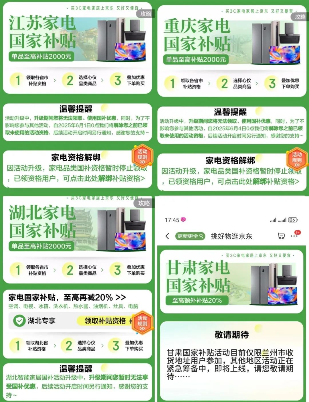 6月1日,江苏率先暂停申领线上家电国家补贴,恢复时间未知。随后,重庆、湖北、甘肃等多地的家电国家补贴出现暂停申领等情况。有行业人士认为,可能跟线上平台价格进一步压缩线下实体店、小商家的生存空间有关。