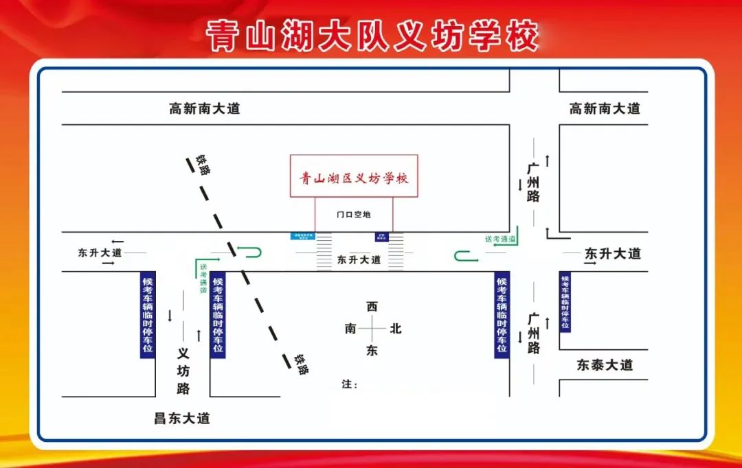 考点周边停车:送考生的机动车可由东升大道广州路口西向南右转的送考通道及东升大道义坊路口东向北右转的送考通道将考生送至义坊学校考点,即停即走,东升大道广州路口至义坊路口段道路两侧禁止停车。候考车辆可将车辆行至义坊农民公寓(大致数量50个停车位)、芳华学校(大约30个停车位)、水木源学校(大约30个停车位)、天亮冷链(大约50个停车位)或东升大道广州路以东、东升大道义坊路以东道路两侧单排停放。