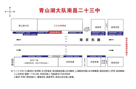 考点周边车流量较大道路:南昌中学青山湖校区(南昌市青山湖区青山湖大道342号)请广大考生及家长看清具体校区考点,提前看好考场。上海北路的国泰路至青山湖大道段、青山湖大道的民安路至国威路段,青山湖大道国泰路口、上海北路青山湖大道口、国威路青山湖大道口等路口、路段在考试前后车流量较大!