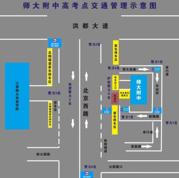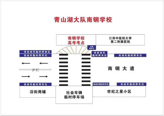 考试期间交通管制:考点东西两侧100米南昌交警会增设警示牌,示意过往车辆勿鸣笛,同时考试开始和结束时南钢大道会进行临时交通管制。