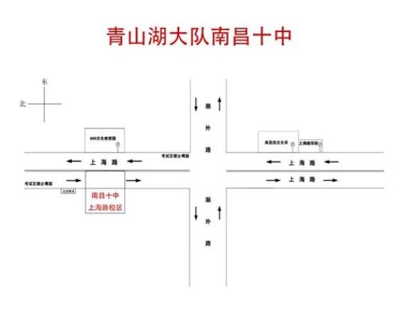 考点周边车流量较大路段:南昌市第十中学上海路校区(南昌市上海路596号)上海路、顺外路、上海路顺外路口这三处7:30—9:00、11:30—12:00、14:00—15:00、16:30—18:30易拥堵,建议考生及家长尽量乘坐公共交通工具,驾乘车辆家长尽可能停放至学校周边停车场步行前往学校。