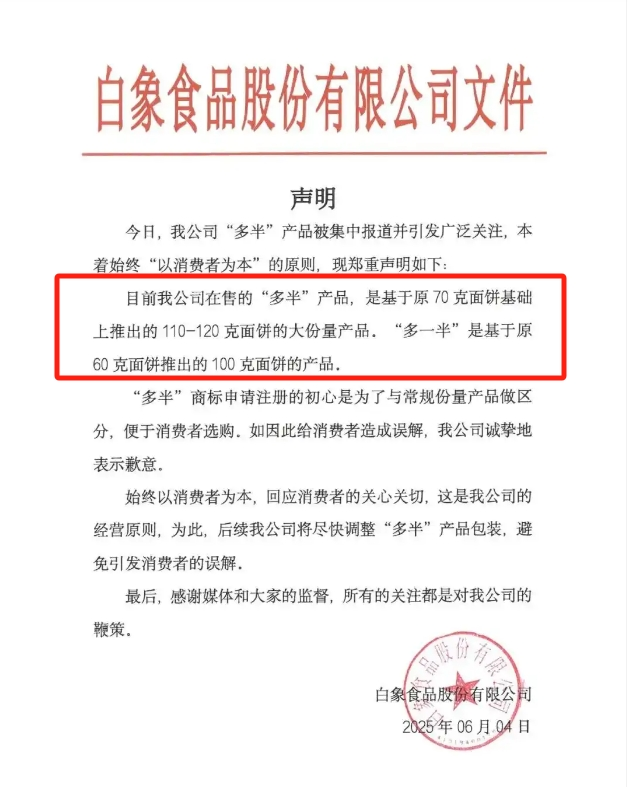 根据白象食品的声明,白象“多半”袋面之实际面饼重量为110-120克,相比原70克基础款增量约57-71%,虽未达到“多一半”(150%)的程度,但仍在汉语“多半”的语义范围内。因此,其欺骗性争议集中在消费者预期管理层面,即:当消费者基于“多半”形成“增量50%以上”的合理期待,而实际增量不足时,可能构成实质性误导。